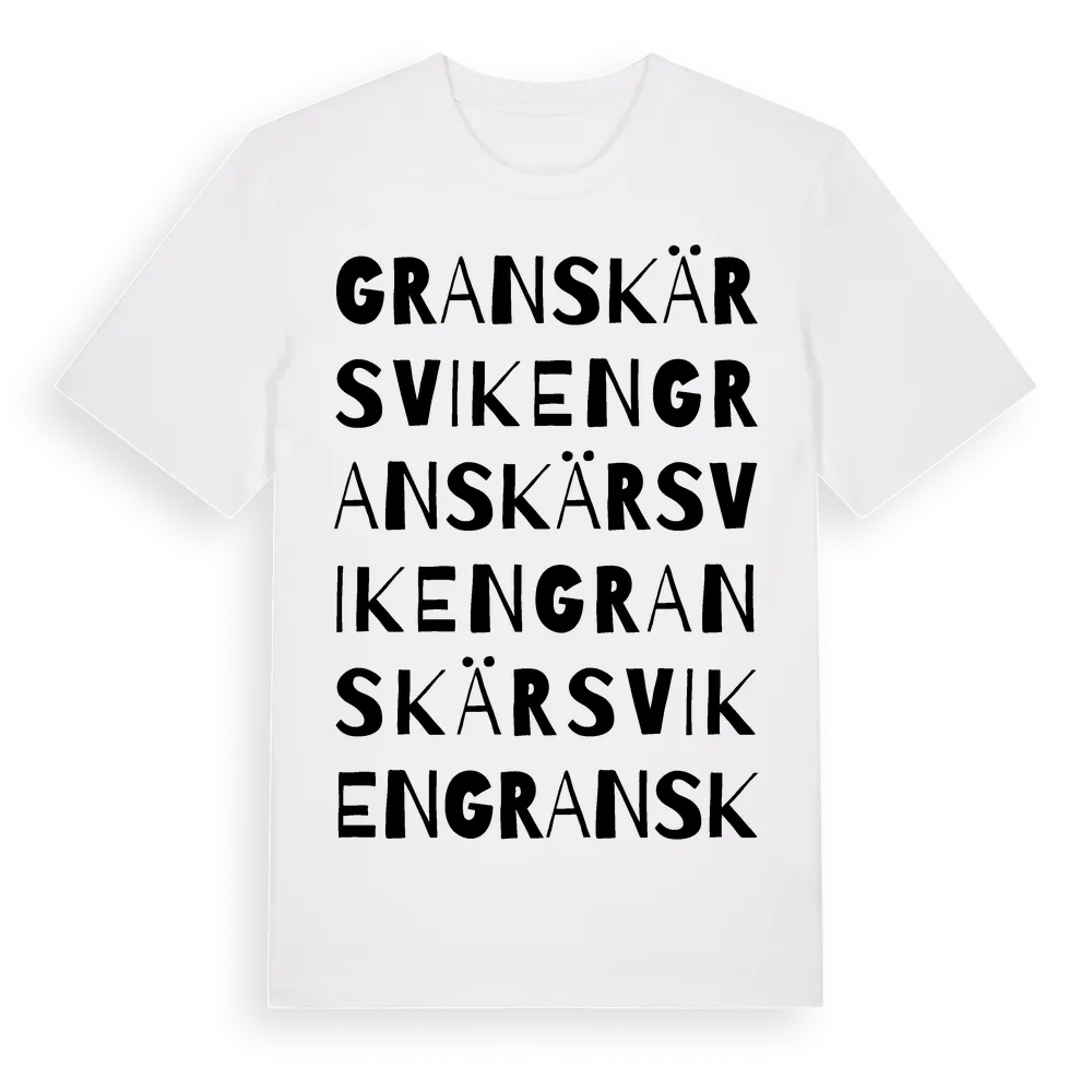 Granskärsviken ordlek t-shirt är inspirerad av byn Granskärsviken i Västerbottens län, Sverige. Tröjan är designad för dig som har en speciell koppling till platsen – oavsett om du bor här, har rötterna här eller bara älskar Granskärsviken.