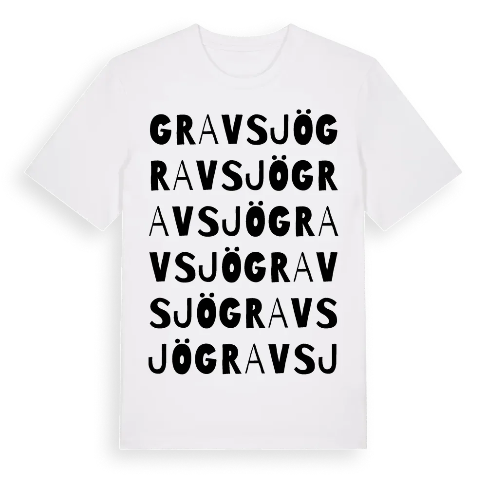Gravsjö ordlek t-shirt är inspirerad av Gravsjö i Västerbottens län, Sverige. Tröjan är designad för dig som har en speciell koppling till platsen – oavsett om du bor här, har rötterna här eller bara älskar Gravsjö.