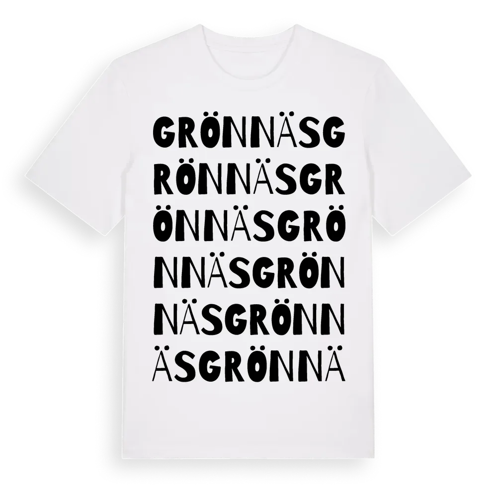 Grönnäs ordlek t-shirt är inspirerad av byn Grönnäs i Västerbottens län, Sverige. Tröjan är designad för dig som har en speciell koppling till platsen – oavsett om du bor här, har rötterna här eller bara älskar Grönnäs.