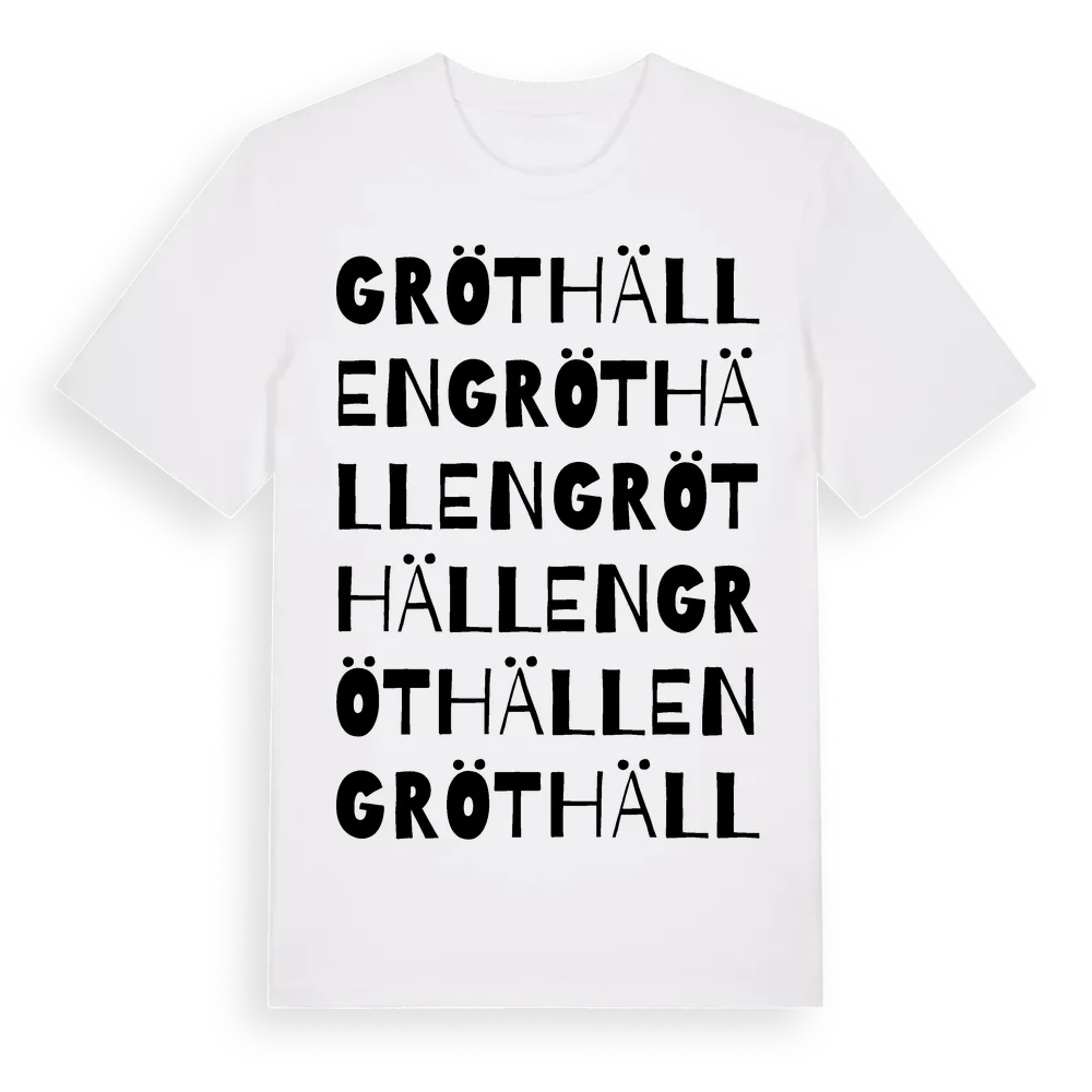 Gröthällen ordlek t-shirt är inspirerad av Gröthällen i Västerbottens län, Sverige. Tröjan är designad för dig som har en speciell koppling till platsen – oavsett om du bor här, har rötterna här eller bara älskar Gröthällen.