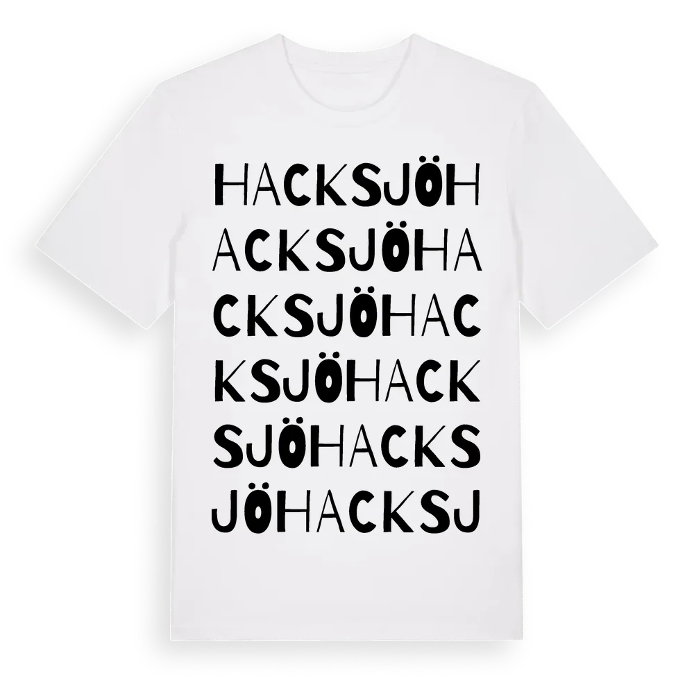 Hacksjö ordlek t-shirt är inspirerad av byn Hacksjö i Västerbottens län, Sverige. Tröjan är designad för dig som har en speciell koppling till platsen – oavsett om du bor här, har rötterna här eller bara älskar Hacksjö.