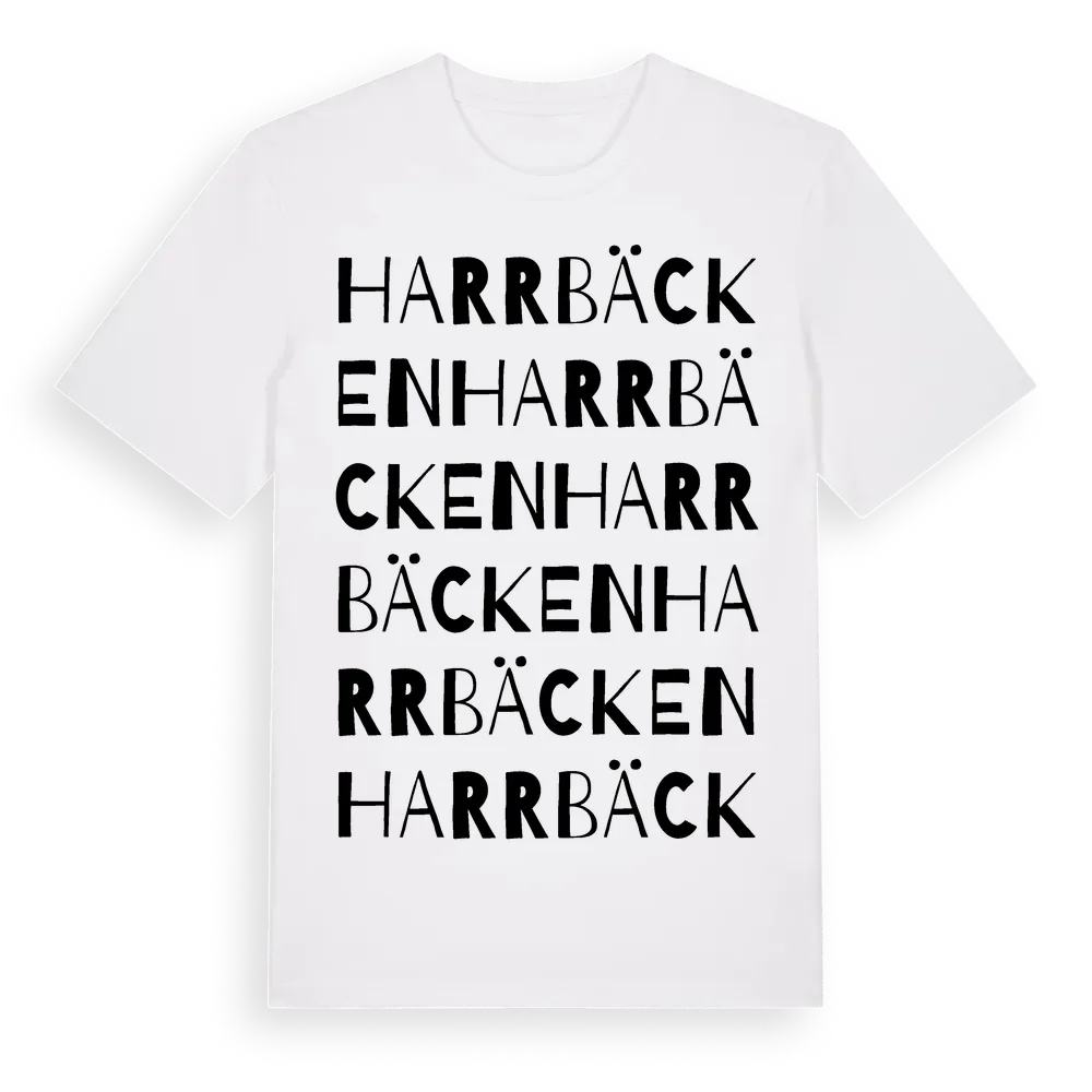 En ordlek byggd på Harrbäckens namn. Subtilt och klurig – ett motiv som bara de som verkligen känner platsen fullt ut förstår. Premium bomull, unisex – från Harrbäcken i Västerbottens län.