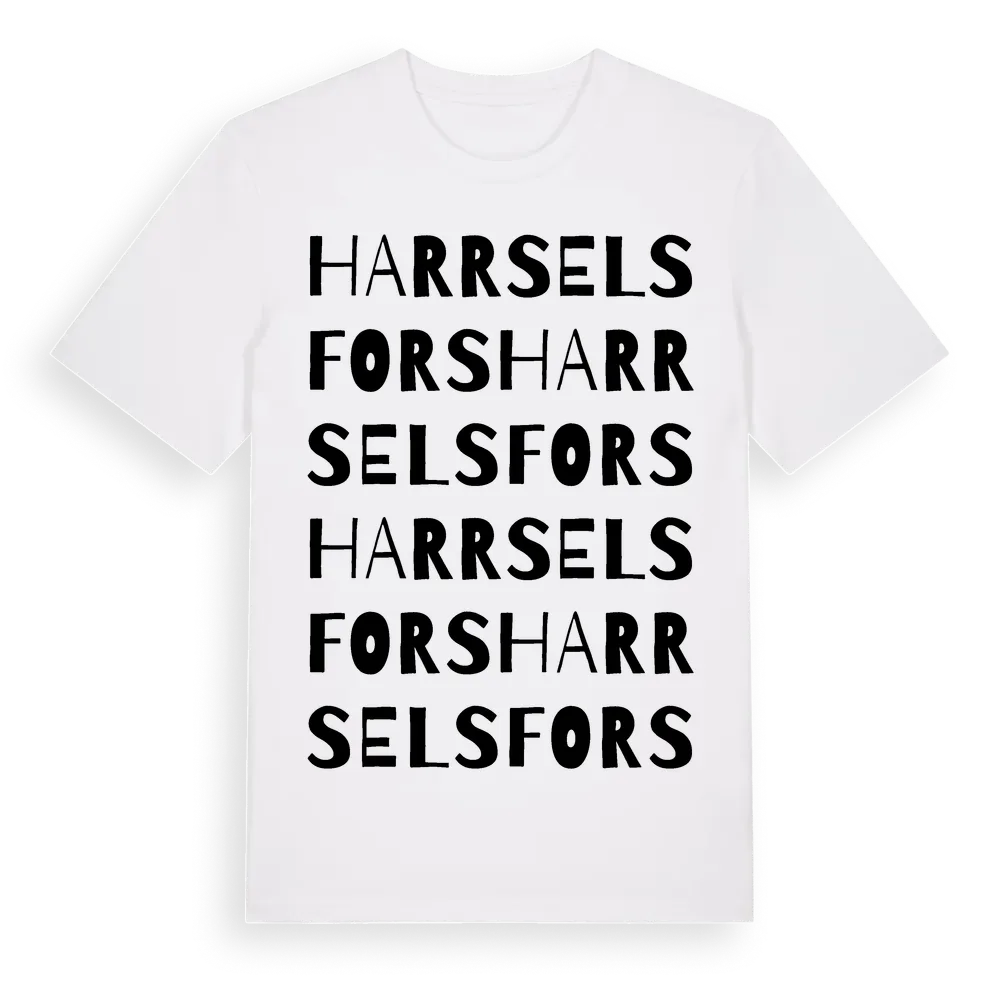 En ordlek byggd på Harrselsforss namn. Subtilt och klurig – ett motiv som bara de som verkligen känner platsen fullt ut förstår. Premium bomull, unisex – från byn Harrselsfors i Västerbottens län.
