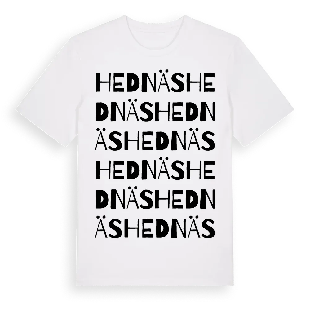 En ordlek byggd på Hednäss namn. Subtilt och klurig – ett motiv som bara de som verkligen känner platsen fullt ut förstår. Premium bomull, unisex – från byn Hednäs i Västerbottens län.
