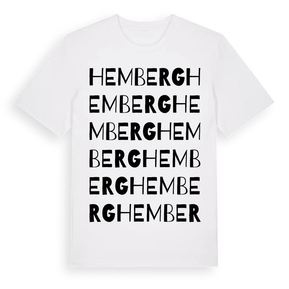 Hemberg ordlek t-shirt är inspirerad av Hemberg i Västerbottens län, Sverige. Tröjan är designad för dig som har en speciell koppling till platsen – oavsett om du bor här, har rötterna här eller bara älskar Hemberg.