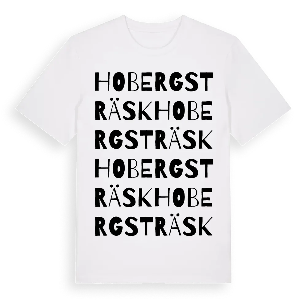 Hobergsträsk ordlek t-shirt är inspirerad av byn Hobergsträsk i Västerbottens län, Sverige. Tröjan är designad för dig som har en speciell koppling till platsen – oavsett om du bor här, har rötterna här eller bara älskar Hobergsträsk.