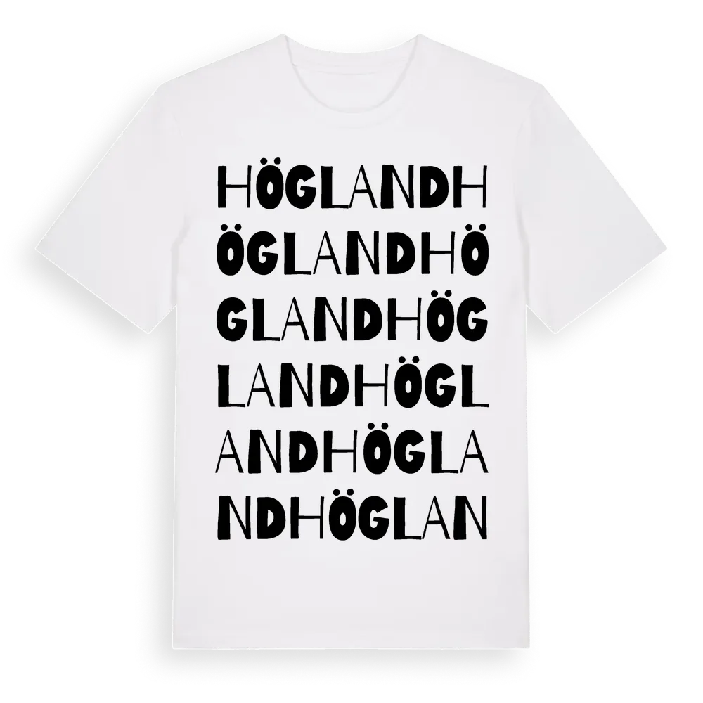 Högland ordlek t-shirt är inspirerad av byn Högland i Västerbottens län, Sverige. Tröjan är designad för dig som har en speciell koppling till platsen – oavsett om du bor här, har rötterna här eller bara älskar Högland.