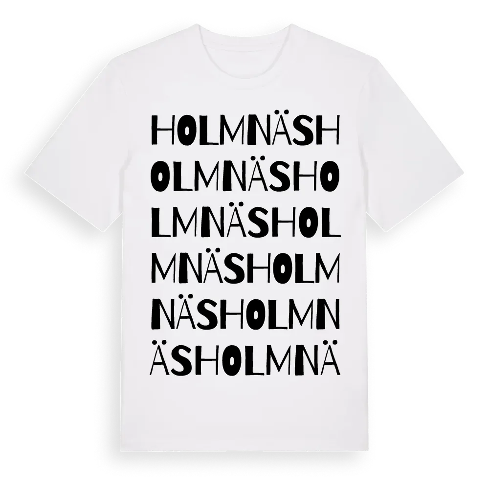 Holmnäs ordlek t-shirt är inspirerad av Holmnäs i Västerbottens län, Sverige. Tröjan är designad för dig som har en speciell koppling till platsen – oavsett om du bor här, har rötterna här eller bara älskar Holmnäs.