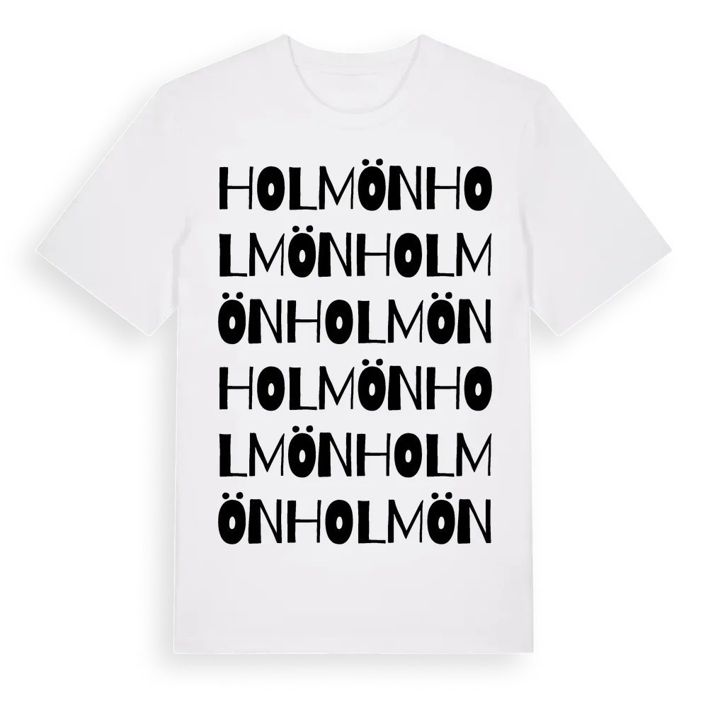 En ordlek byggd på Holmöns namn. Subtilt och klurig – ett motiv som bara de som verkligen känner platsen fullt ut förstår. Premium bomull, unisex – från ön Holmön i Västerbottens län.