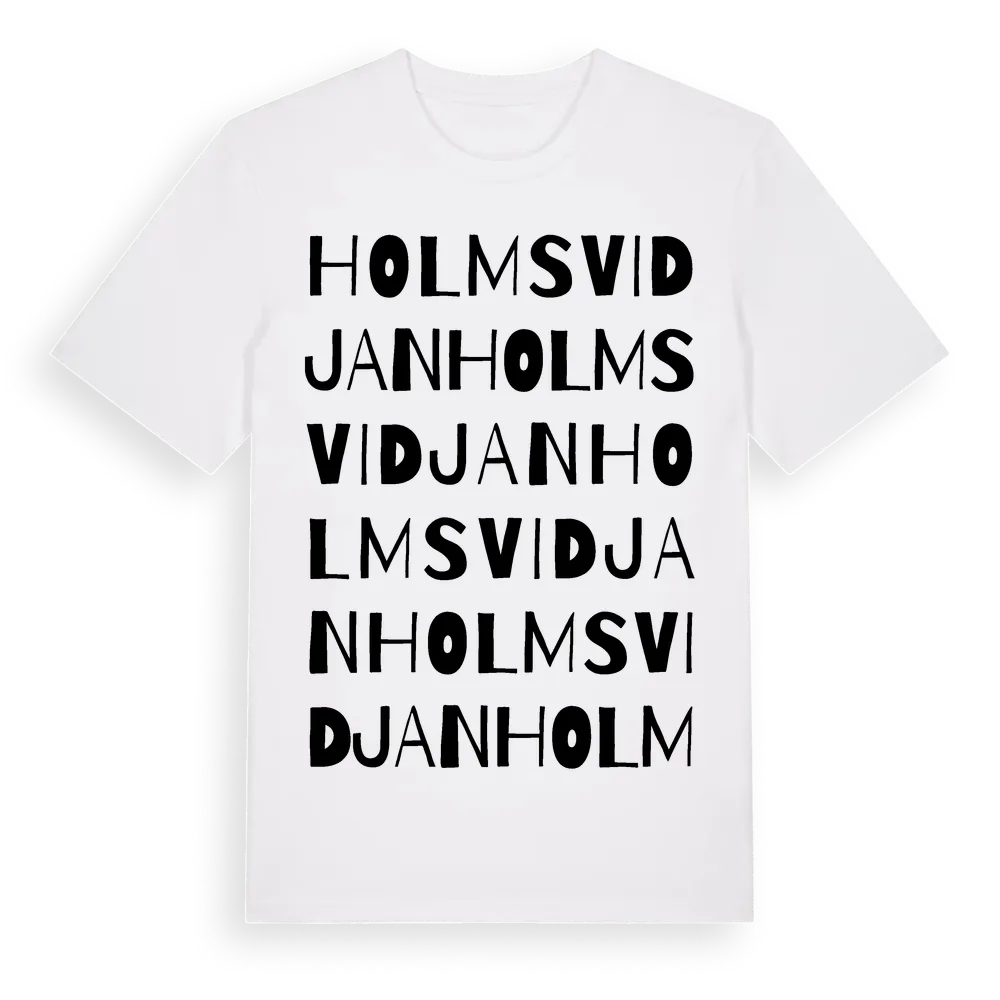 Holmsvidjan ordlek t-shirt är inspirerad av Holmsvidjan i Västerbottens län, Sverige. Tröjan är designad för dig som har en speciell koppling till platsen – oavsett om du bor här, har rötterna här eller bara älskar Holmsvidjan.