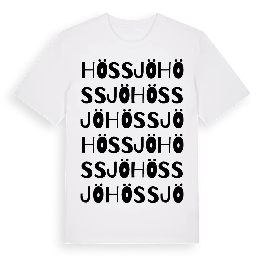 Hössjö ordlek t-shirt är inspirerad av byn Hössjö i Västerbottens län, Sverige. Tröjan är designad för dig som har en speciell koppling till platsen – oavsett om du bor här, har rötterna här eller bara älskar Hössjö.