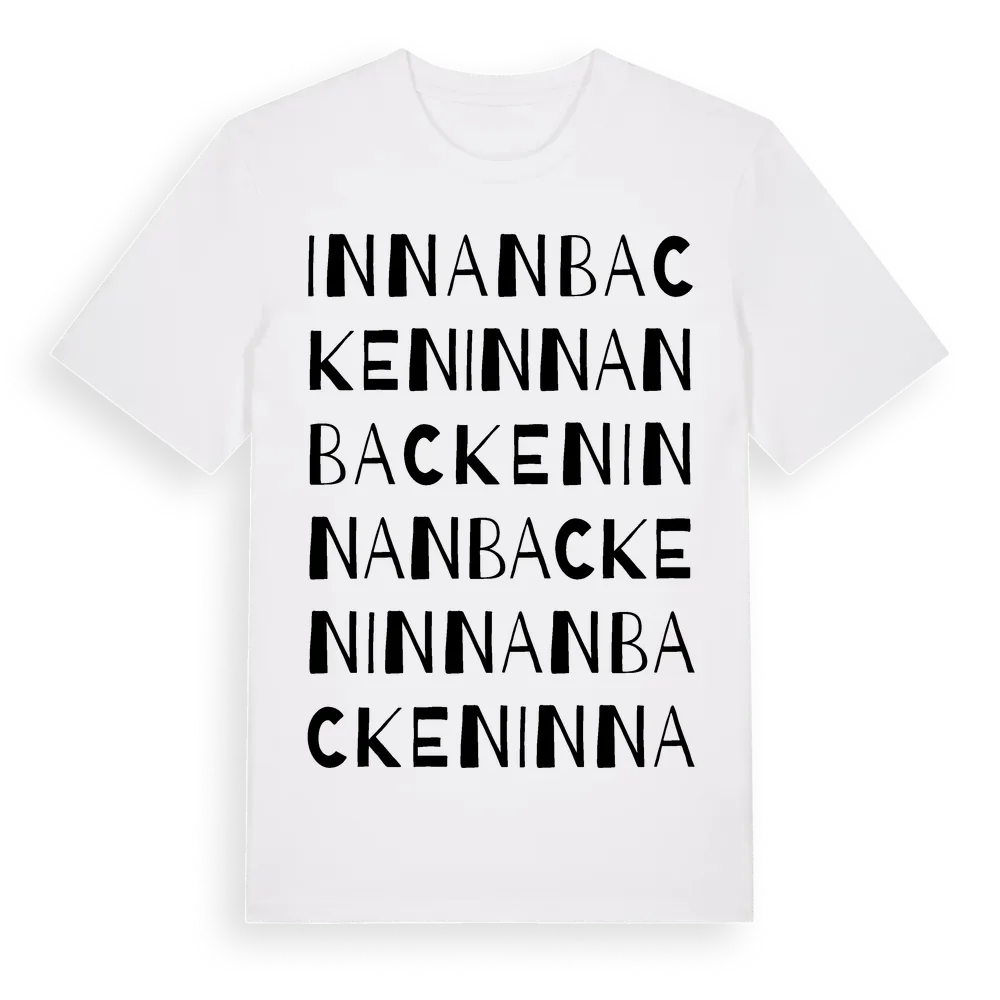 Innanbacken ordlek t-shirt är inspirerad av byn Innanbacken i Västerbottens län, Sverige. Tröjan är designad för dig som har en speciell koppling till platsen – oavsett om du bor här, har rötterna här eller bara älskar Innanbacken.