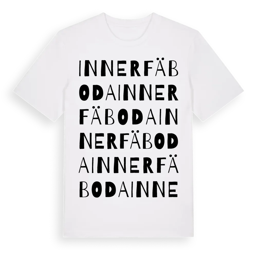 Innerfäboda ordlek t-shirt är inspirerad av byn Innerfäboda i Västerbottens län, Sverige. Tröjan är designad för dig som har en speciell koppling till platsen – oavsett om du bor här, har rötterna här eller bara älskar Innerfäboda.