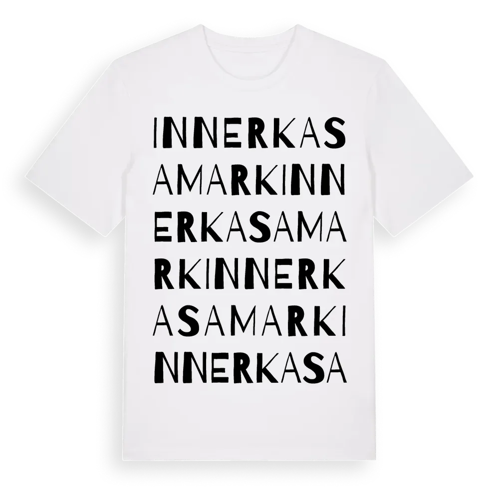 Innerkasamark ordlek t-shirt är inspirerad av byn Innerkasamark i Västerbottens län, Sverige. Tröjan är designad för dig som har en speciell koppling till platsen – oavsett om du bor här, har rötterna här eller bara älskar Innerkasamark.