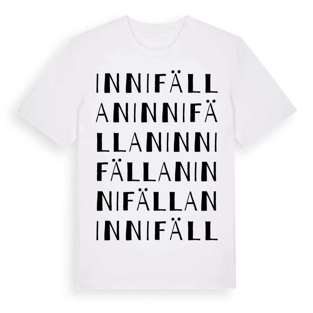 Innifällan ordlek t-shirt är inspirerad av byn Innifällan i Västerbottens län, Sverige. Tröjan är designad för dig som har en speciell koppling till platsen – oavsett om du bor här, har rötterna här eller bara älskar Innifällan.