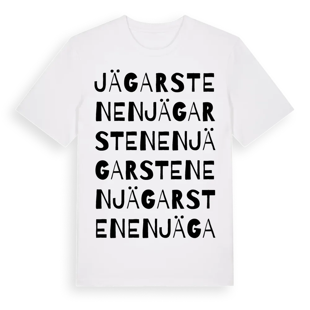 Jägarstenen ordlek t-shirt är inspirerad av Jägarstenen i Västerbottens län, Sverige. Tröjan är designad för dig som har en speciell koppling till platsen – oavsett om du bor här, har rötterna här eller bara älskar Jägarstenen.
