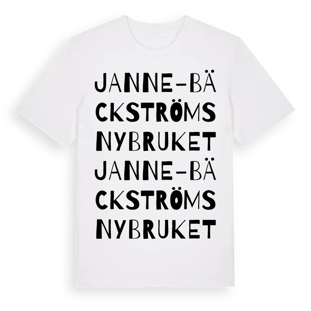 En ordlek byggd på Janne-Bäckströmsnybrukets namn. Subtilt och klurig – ett motiv som bara de som verkligen känner platsen fullt ut förstår. Premium bomull, unisex – från Janne-Bäckströmsnybruket i Västerbottens län.