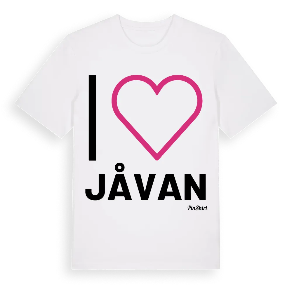 Det klassiska "I ❤ Jåvan"-motivet i stort format som täcker hela bröstet. För dig som vill visa kärleken till Jåvan på riktigt. Premium bomull, unisex – från Jåvan i Västerbottens län.