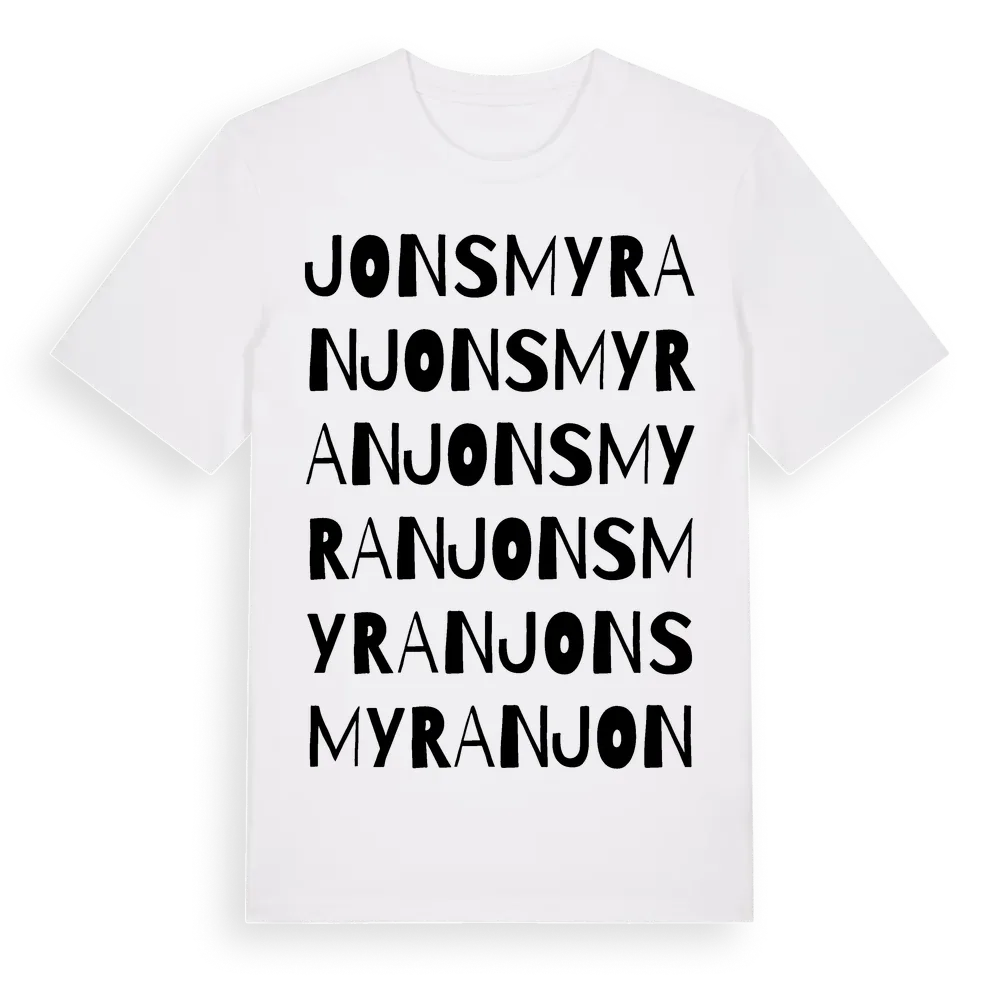 En ordlek byggd på Jonsmyrans namn. Subtilt och klurig – ett motiv som bara de som verkligen känner platsen fullt ut förstår. Premium bomull, unisex – från Jonsmyran i Västerbottens län.