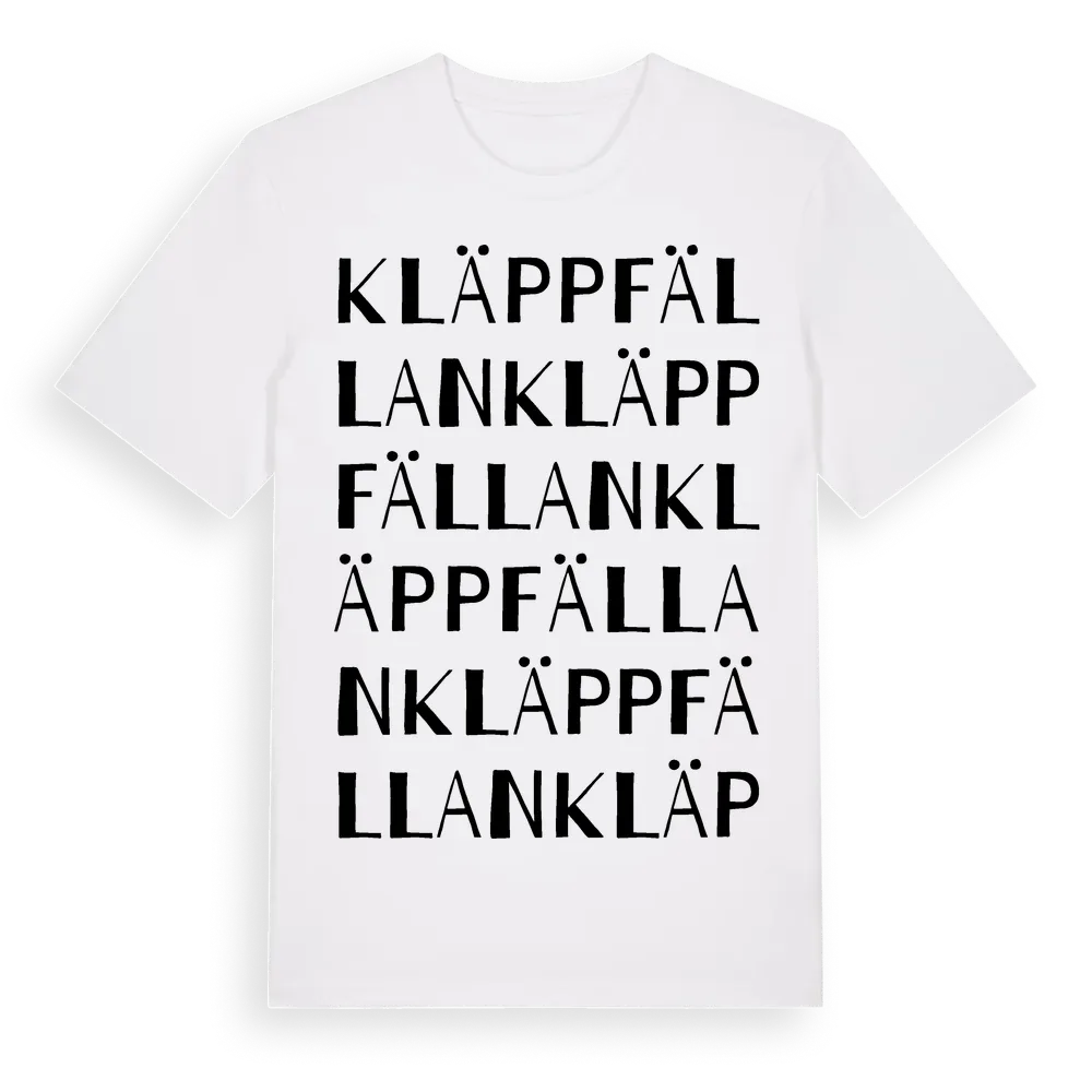 Kläppfällan ordlek t-shirt är inspirerad av Kläppfällan i Västerbottens län, Sverige. Tröjan är designad för dig som har en speciell koppling till platsen – oavsett om du bor här, har rötterna här eller bara älskar Kläppfällan.