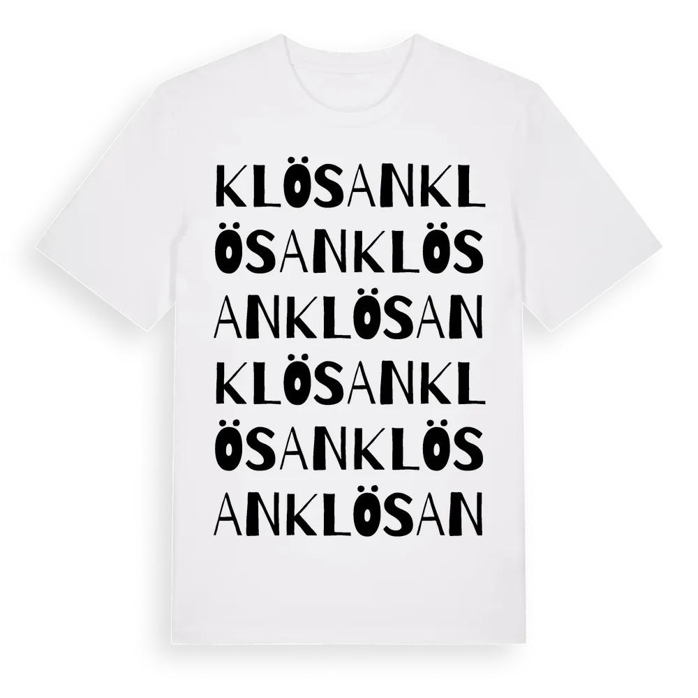 Klösan ordlek t-shirt är inspirerad av byn Klösan i Västerbottens län, Sverige. Tröjan är designad för dig som har en speciell koppling till platsen – oavsett om du bor här, har rötterna här eller bara älskar Klösan.