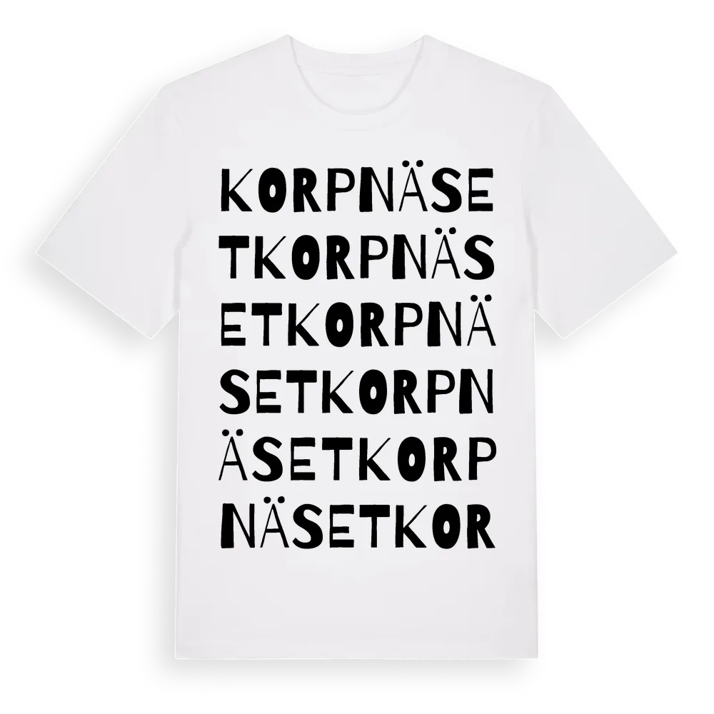 Korpnäset ordlek t-shirt är inspirerad av Korpnäset i Västerbottens län, Sverige. Tröjan är designad för dig som har en speciell koppling till platsen – oavsett om du bor här, har rötterna här eller bara älskar Korpnäset.