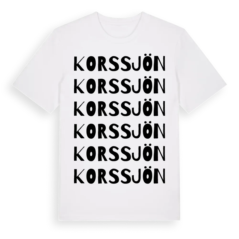 Korssjön ordlek t-shirt är inspirerad av byn Korssjön i Västerbottens län, Sverige. Tröjan är designad för dig som har en speciell koppling till platsen – oavsett om du bor här, har rötterna här eller bara älskar Korssjön.