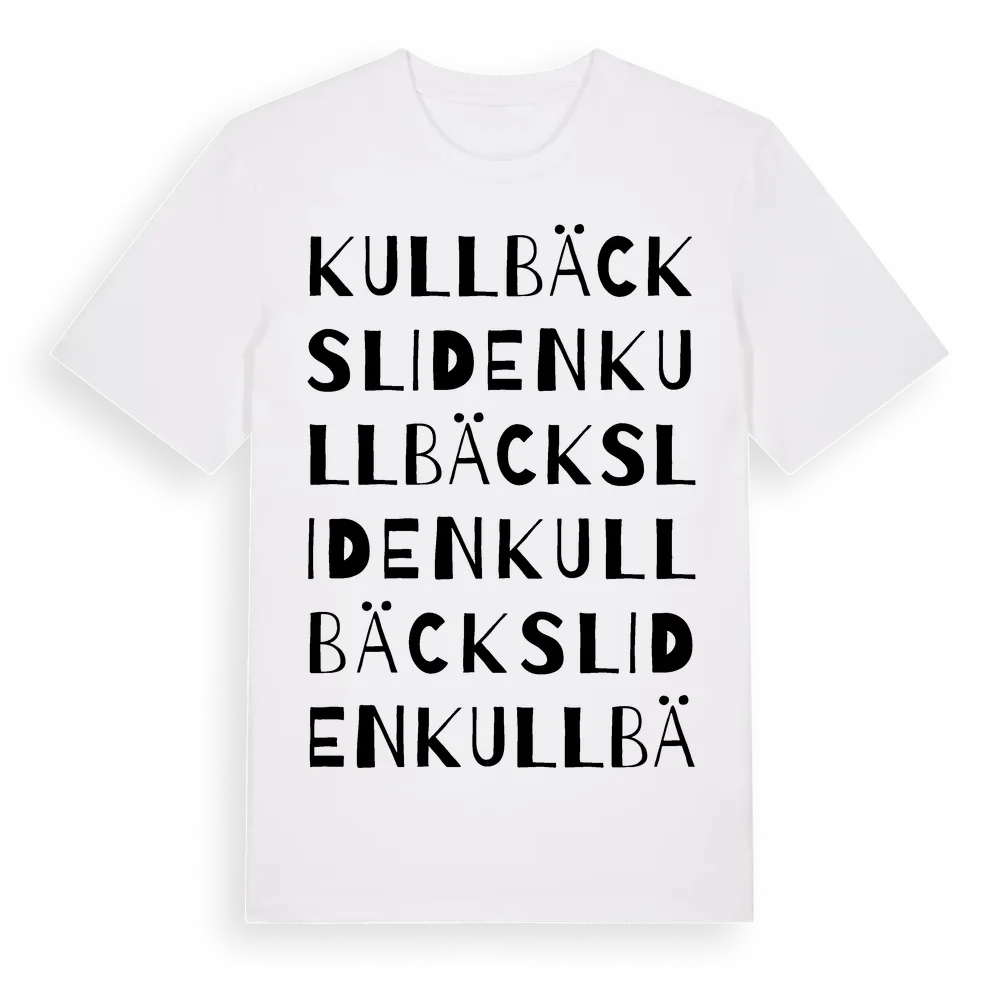 Kullbäcksliden ordlek t-shirt är inspirerad av byn Kullbäcksliden i Västerbottens län, Sverige. Tröjan är designad för dig som har en speciell koppling till platsen – oavsett om du bor här, har rötterna här eller bara älskar Kullbäcksliden.