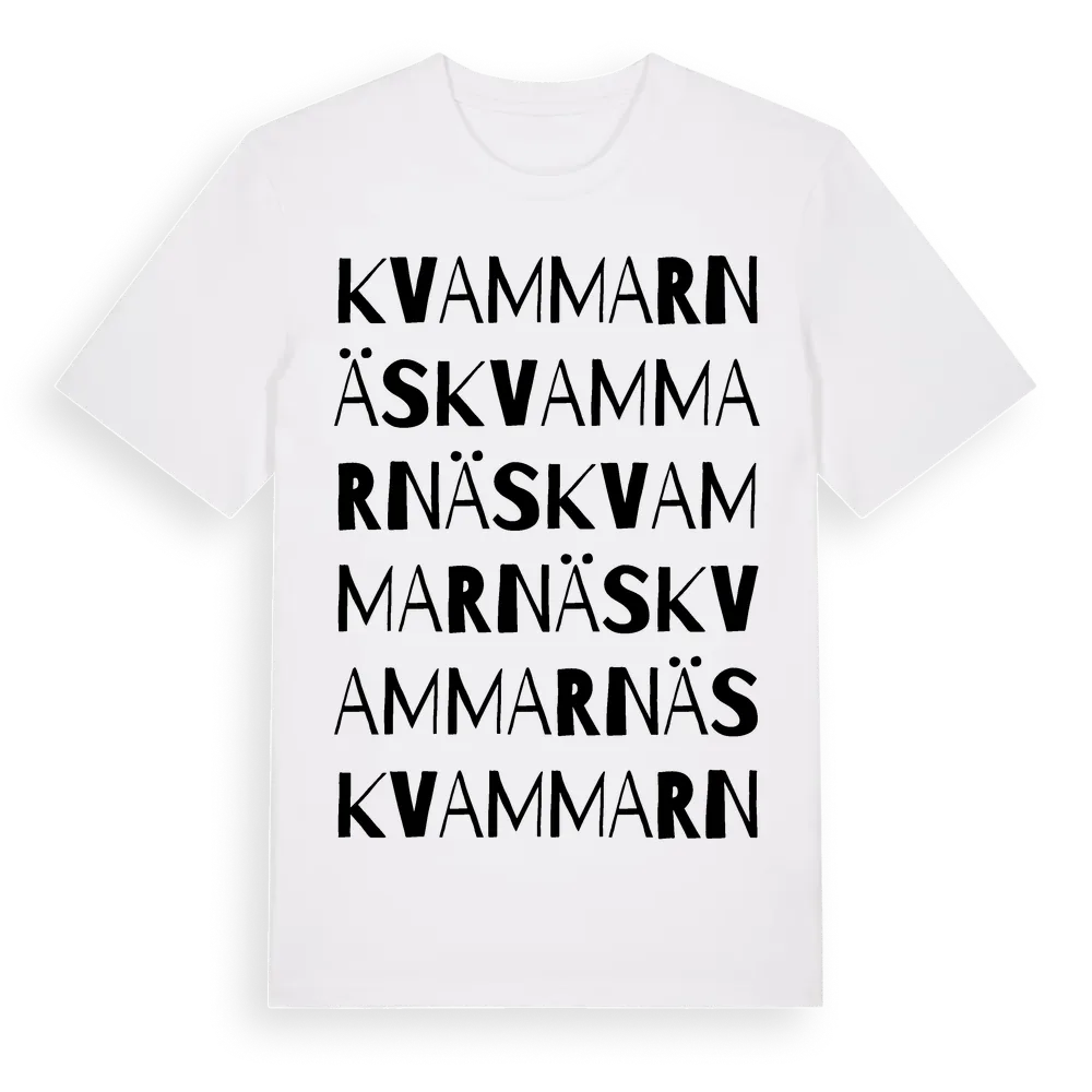 Kvammarnäs ordlek t-shirt är inspirerad av byn Kvammarnäs i Västerbottens län, Sverige. Tröjan är designad för dig som har en speciell koppling till platsen – oavsett om du bor här, har rötterna här eller bara älskar Kvammarnäs.
