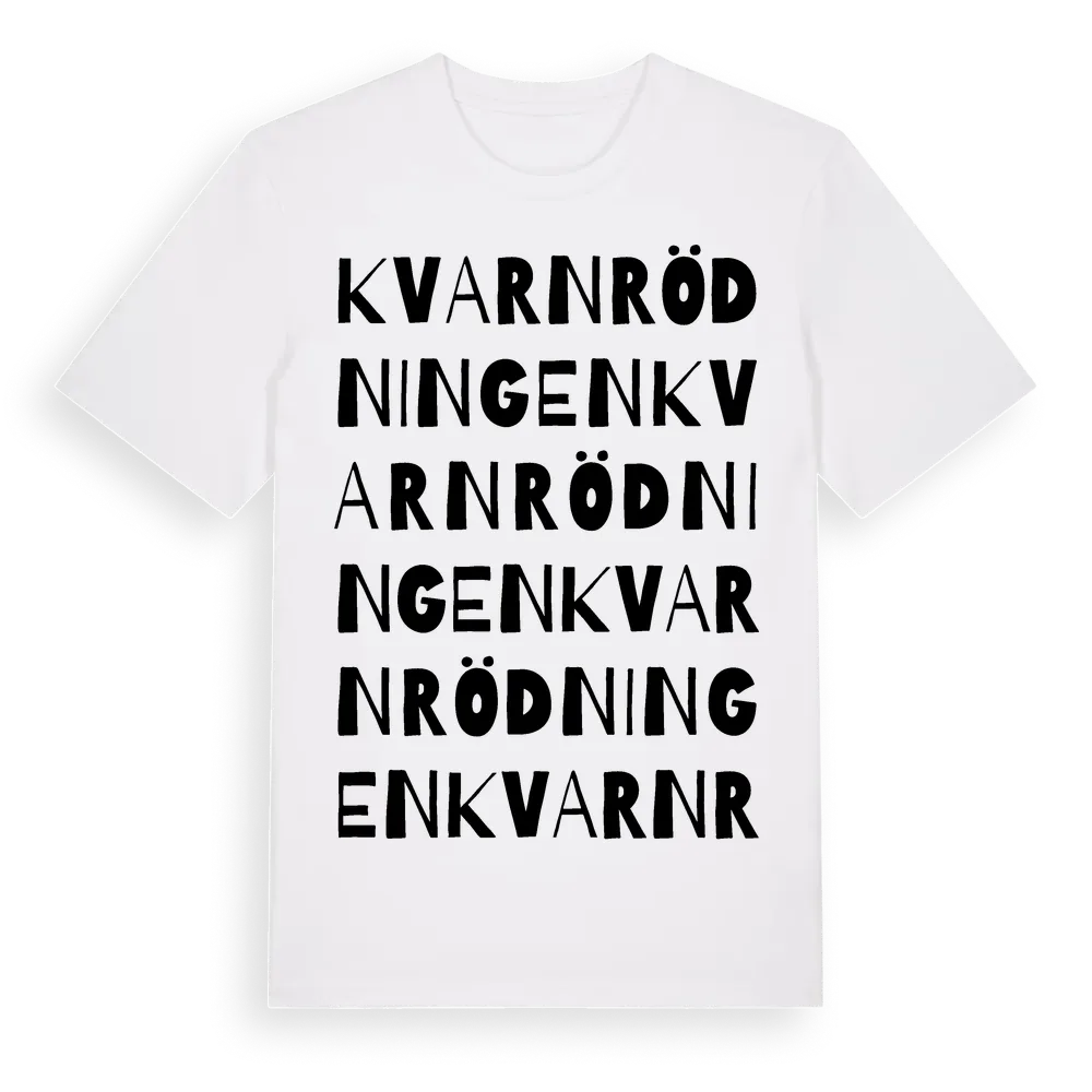 Kvarnrödningen ordlek t-shirt är inspirerad av byn Kvarnrödningen i Västerbottens län, Sverige. Tröjan är designad för dig som har en speciell koppling till platsen – oavsett om du bor här, har rötterna här eller bara älskar Kvarnrödningen.