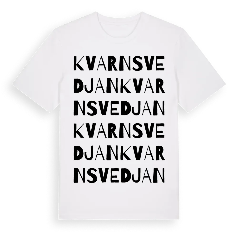 Kvarnsvedjan ordlek t-shirt är inspirerad av Kvarnsvedjan i Västerbottens län, Sverige. Tröjan är designad för dig som har en speciell koppling till platsen – oavsett om du bor här, har rötterna här eller bara älskar Kvarnsvedjan.