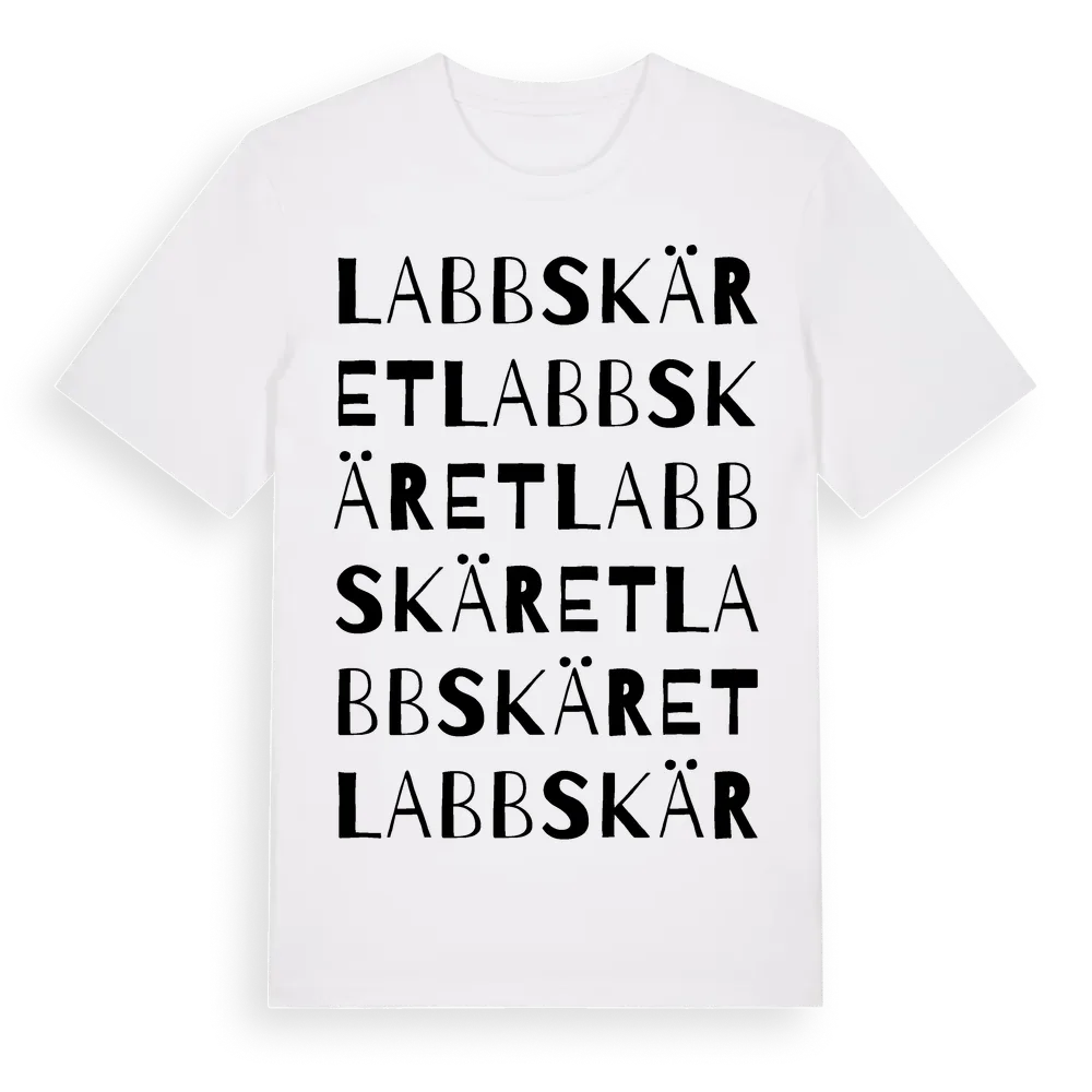 Labbskäret ordlek t-shirt är inspirerad av Labbskäret i Västerbottens län, Sverige. Tröjan är designad för dig som har en speciell koppling till platsen – oavsett om du bor här, har rötterna här eller bara älskar Labbskäret.