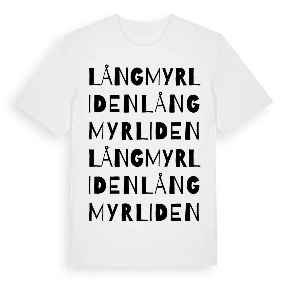 Långmyrliden ordlek t-shirt är inspirerad av Långmyrliden i Västerbottens län, Sverige. Tröjan är designad för dig som har en speciell koppling till platsen – oavsett om du bor här, har rötterna här eller bara älskar Långmyrliden.