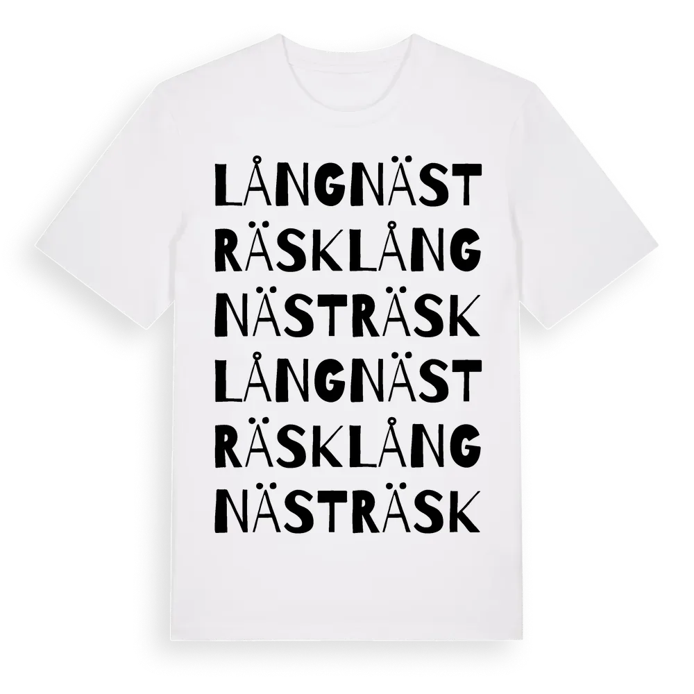 En ordlek byggd på Långnästräsks namn. Subtilt och klurig – ett motiv som bara de som verkligen känner platsen fullt ut förstår. Premium bomull, unisex – från Långnästräsk i Västerbottens län.