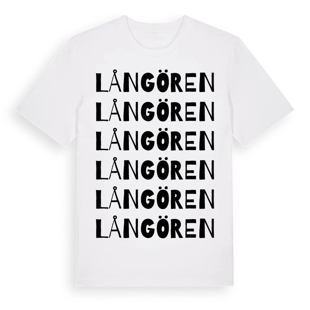 Långören ordlek t-shirt är inspirerad av Långören i Västerbottens län, Sverige. Tröjan är designad för dig som har en speciell koppling till platsen – oavsett om du bor här, har rötterna här eller bara älskar Långören.