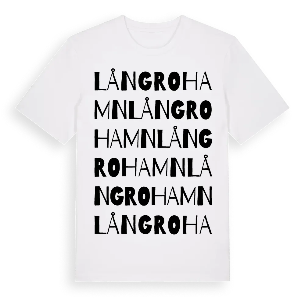 Långrohamn ordlek t-shirt är inspirerad av Långrohamn i Västerbottens län, Sverige. Tröjan är designad för dig som har en speciell koppling till platsen – oavsett om du bor här, har rötterna här eller bara älskar Långrohamn.
