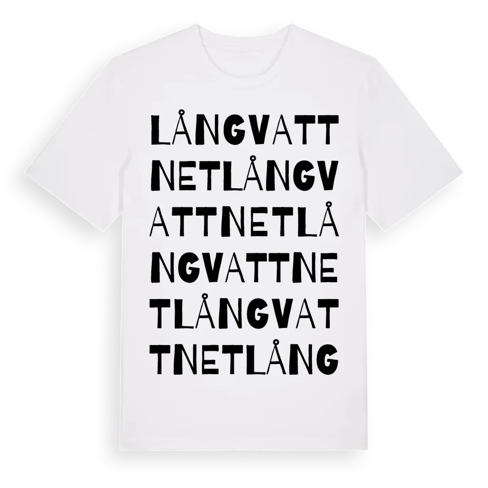 Långvattnet ordlek t-shirt är inspirerad av byn Långvattnet i Västerbottens län, Sverige. Tröjan är designad för dig som har en speciell koppling till platsen – oavsett om du bor här, har rötterna här eller bara älskar Långvattnet.