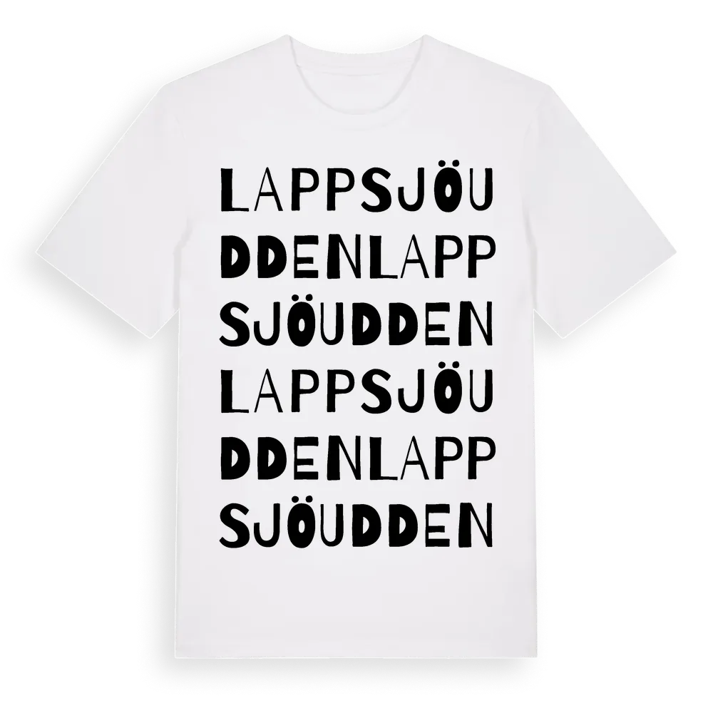 Lappsjöudden ordlek t-shirt är inspirerad av Lappsjöudden i Västerbottens län, Sverige. Tröjan är designad för dig som har en speciell koppling till platsen – oavsett om du bor här, har rötterna här eller bara älskar Lappsjöudden.