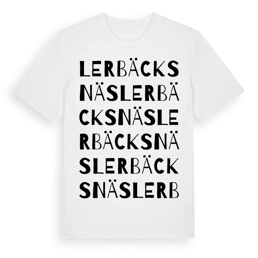 Lerbäcksnäs ordlek t-shirt är inspirerad av Lerbäcksnäs i Västerbottens län, Sverige. Tröjan är designad för dig som har en speciell koppling till platsen – oavsett om du bor här, har rötterna här eller bara älskar Lerbäcksnäs.