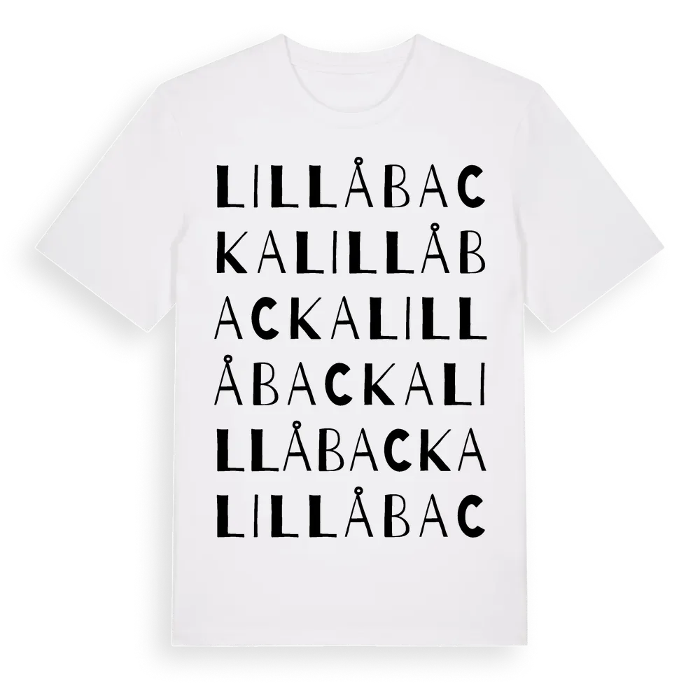 Lillåbacka ordlek t-shirt är inspirerad av Lillåbacka i Västerbottens län, Sverige. Tröjan är designad för dig som har en speciell koppling till platsen – oavsett om du bor här, har rötterna här eller bara älskar Lillåbacka.