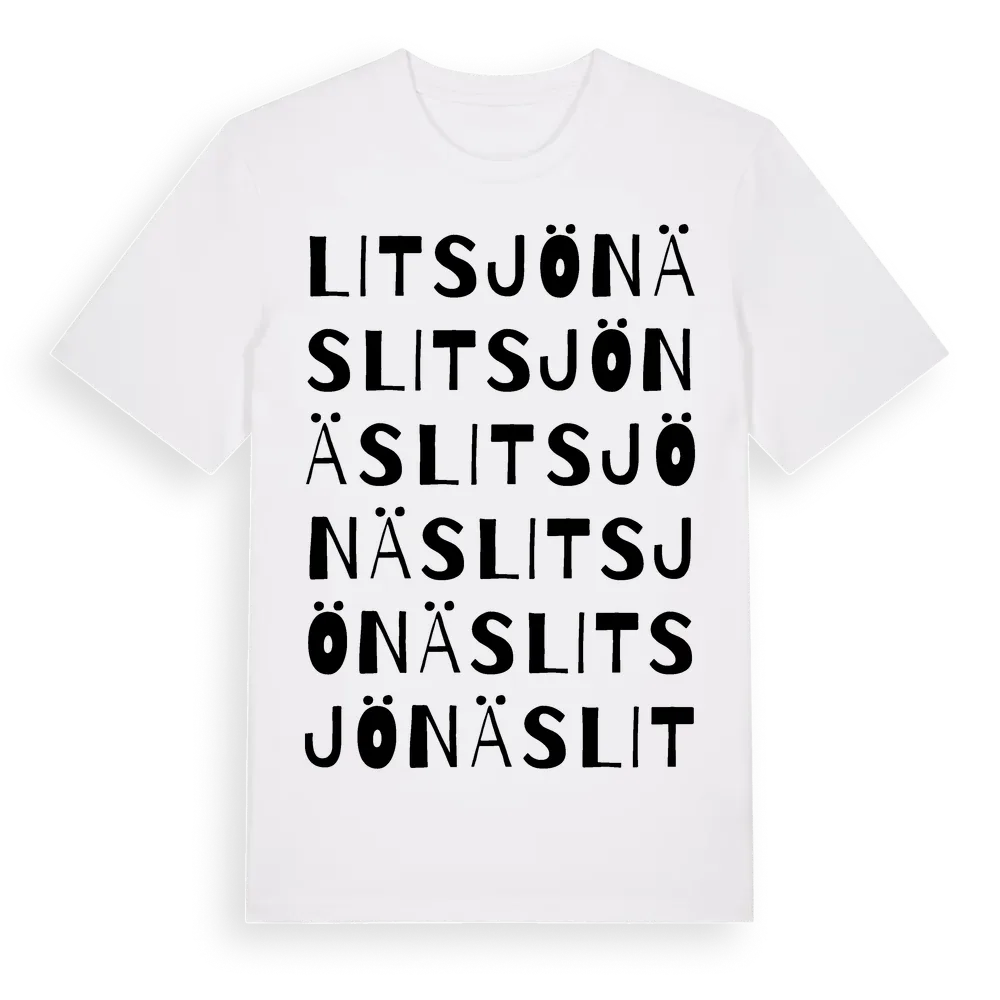 Litsjönäs ordlek t-shirt är inspirerad av byn Litsjönäs i Västerbottens län, Sverige. Tröjan är designad för dig som har en speciell koppling till platsen – oavsett om du bor här, har rötterna här eller bara älskar Litsjönäs.