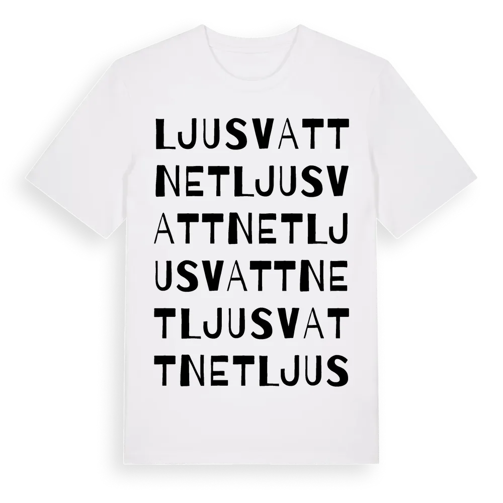 Ljusvattnet ordlek t-shirt är inspirerad av Ljusvattnet i Västerbottens län, Sverige. Tröjan är designad för dig som har en speciell koppling till platsen – oavsett om du bor här, har rötterna här eller bara älskar Ljusvattnet.