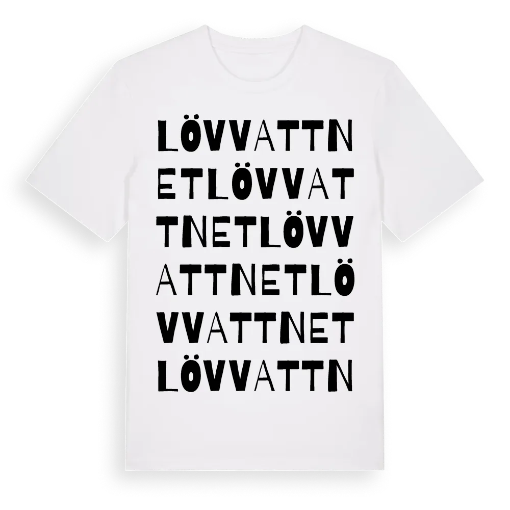 Lövvattnet ordlek t-shirt är inspirerad av byn Lövvattnet i Västerbottens län, Sverige. Tröjan är designad för dig som har en speciell koppling till platsen – oavsett om du bor här, har rötterna här eller bara älskar Lövvattnet.
