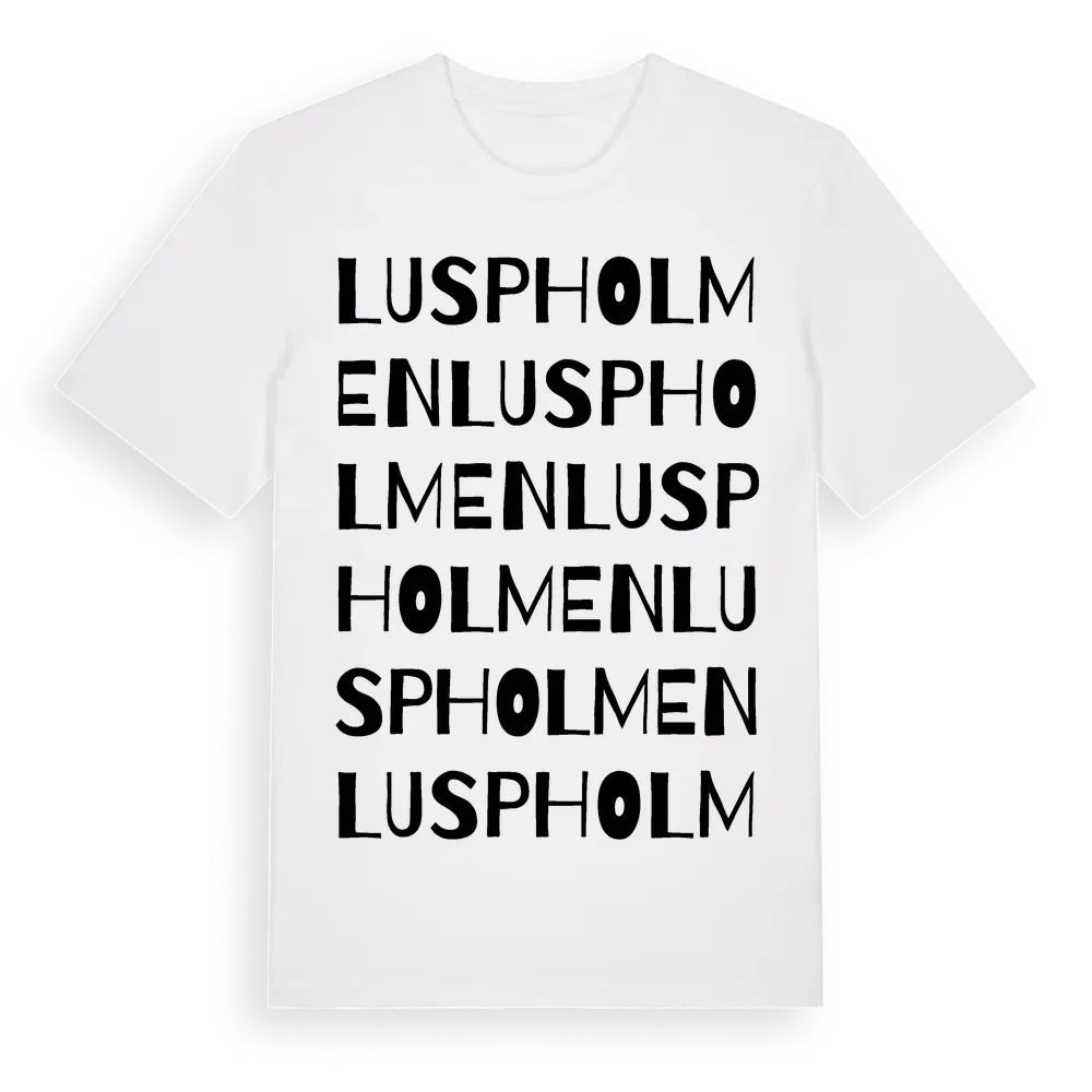 Luspholmen ordlek t-shirt är inspirerad av ön Luspholmen i Västerbottens län, Sverige. Tröjan är designad för dig som har en speciell koppling till platsen – oavsett om du bor här, har rötterna här eller bara älskar Luspholmen.