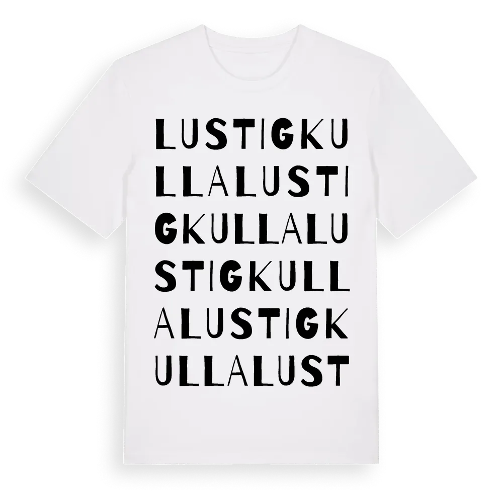Lustigkulla ordlek t-shirt är inspirerad av Lustigkulla i Västerbottens län, Sverige. Tröjan är designad för dig som har en speciell koppling till platsen – oavsett om du bor här, har rötterna här eller bara älskar Lustigkulla.