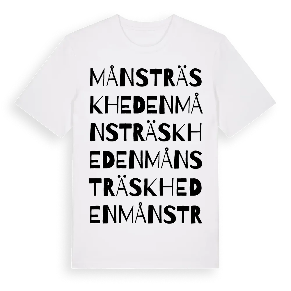 Månsträskheden ordlek t-shirt är inspirerad av Månsträskheden i Västerbottens län, Sverige. Tröjan är designad för dig som har en speciell koppling till platsen – oavsett om du bor här, har rötterna här eller bara älskar Månsträskheden.