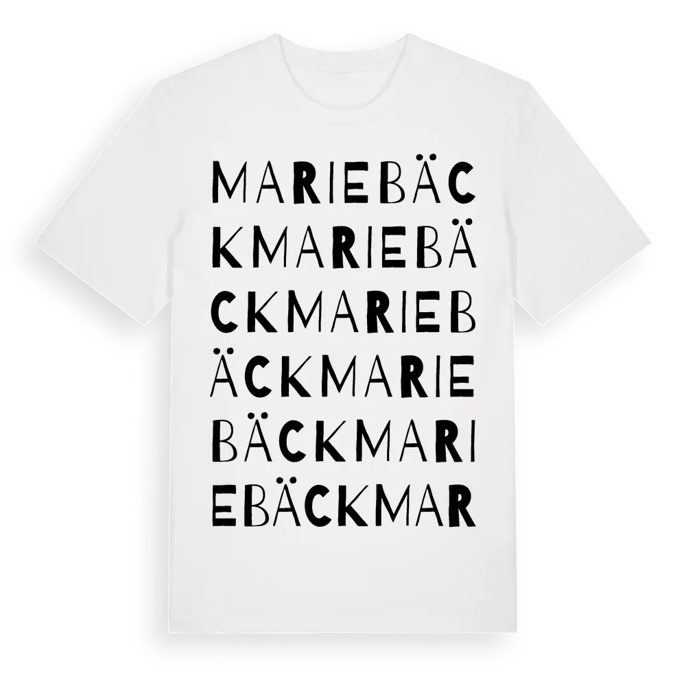 Mariebäck ordlek t-shirt är inspirerad av stadsdelen Mariebäck i Västerbottens län, Sverige. Tröjan är designad för dig som har en speciell koppling till platsen – oavsett om du bor här, har rötterna här eller bara älskar Mariebäck.