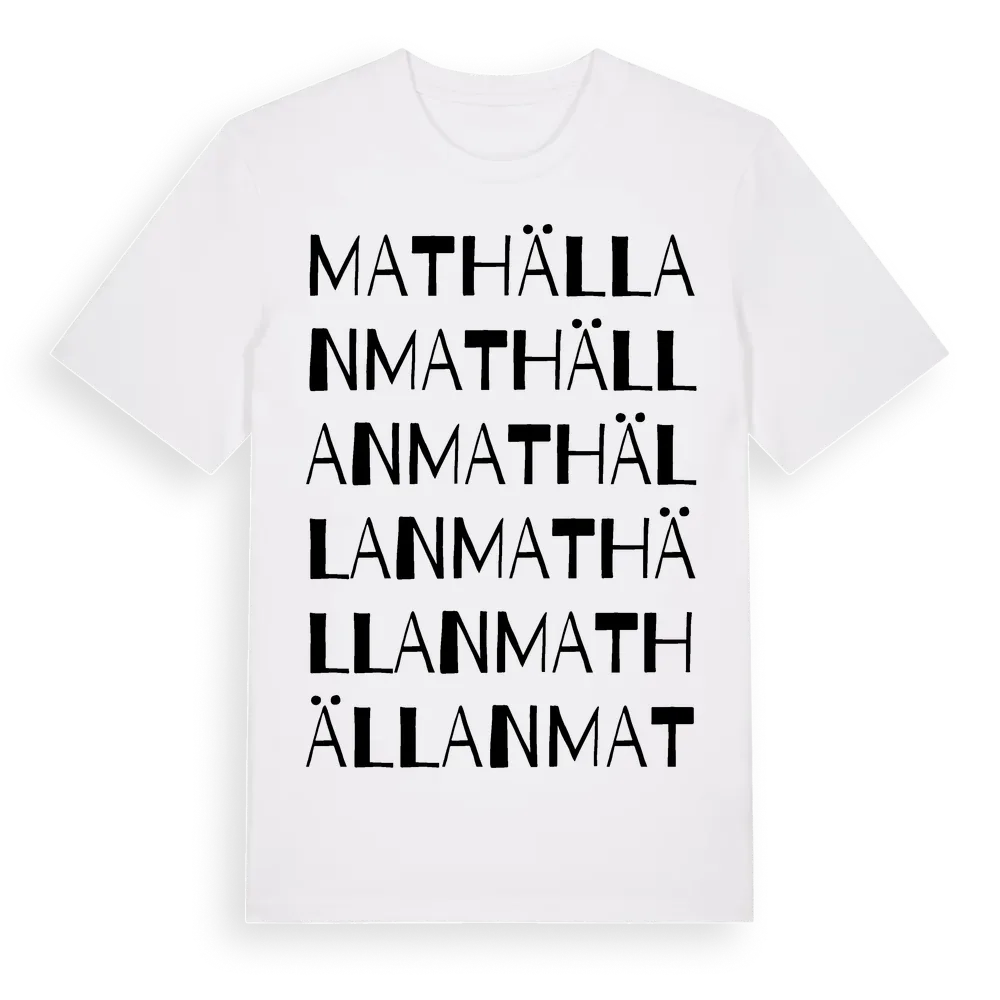 Mathällan ordlek t-shirt är inspirerad av stadsdelen Mathällan i Västerbottens län, Sverige. Tröjan är designad för dig som har en speciell koppling till platsen – oavsett om du bor här, har rötterna här eller bara älskar Mathällan.