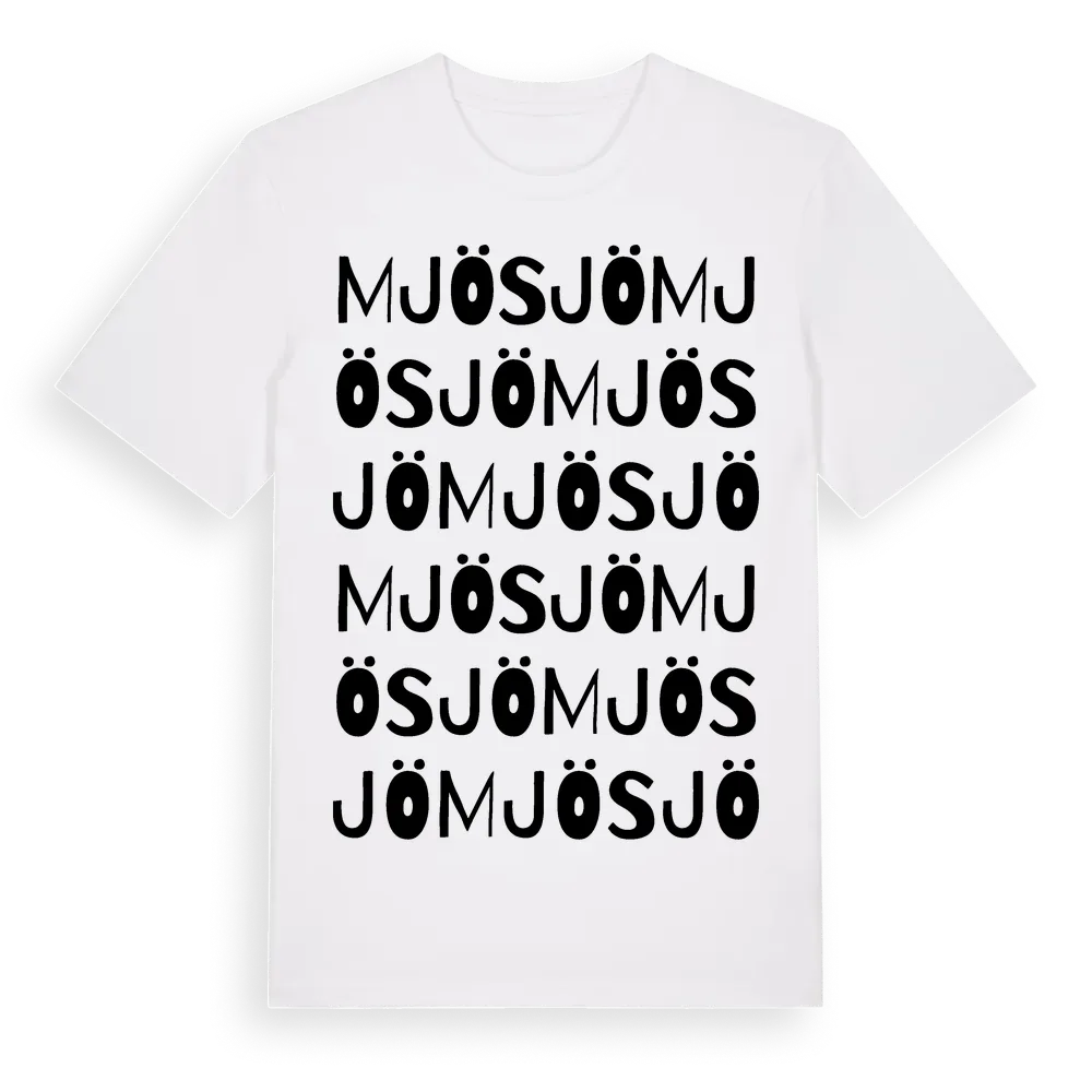 Mjösjö ordlek t-shirt är inspirerad av byn Mjösjö i Västerbottens län, Sverige. Tröjan är designad för dig som har en speciell koppling till platsen – oavsett om du bor här, har rötterna här eller bara älskar Mjösjö.