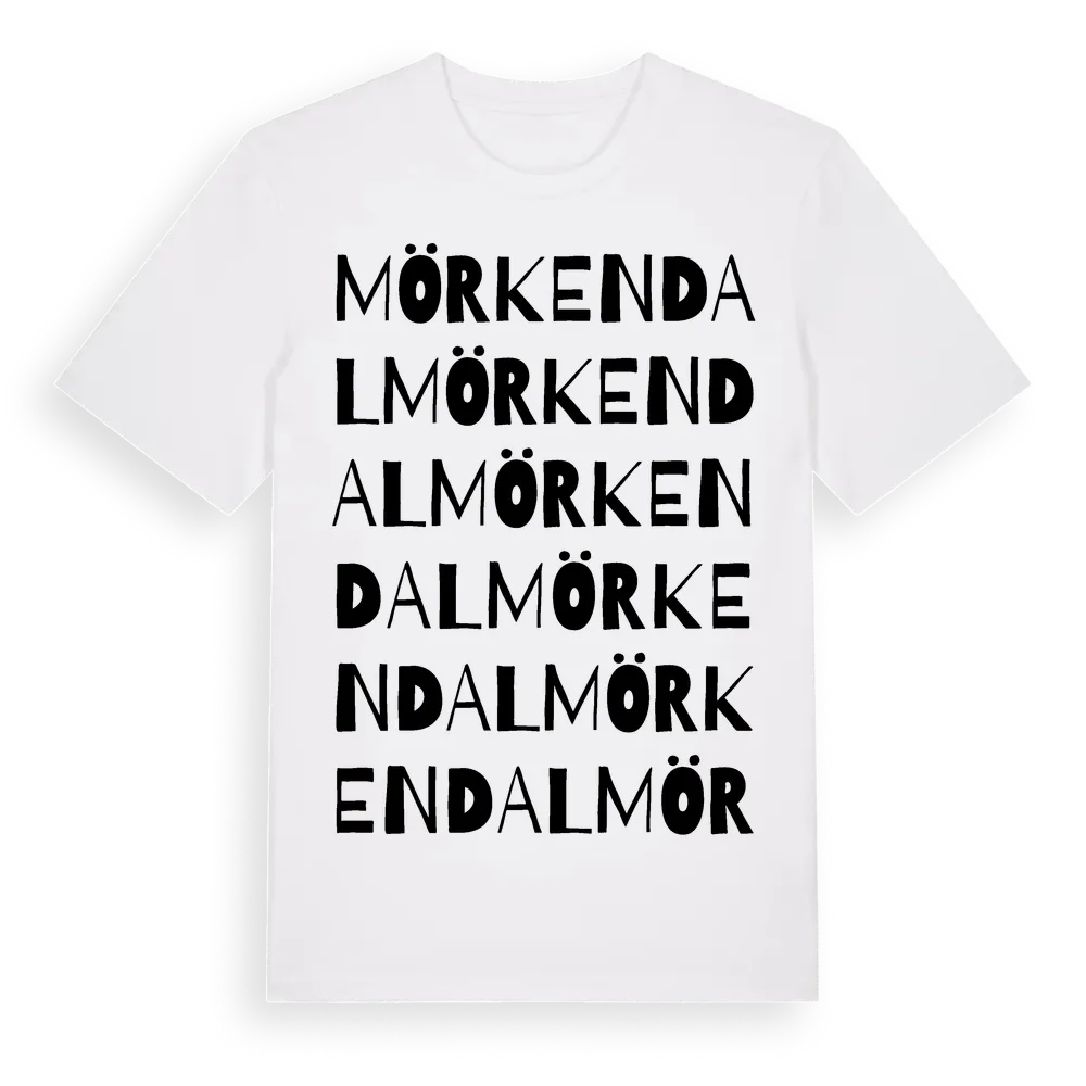 Mörkendal ordlek t-shirt är inspirerad av Mörkendal i Västerbottens län, Sverige. Tröjan är designad för dig som har en speciell koppling till platsen – oavsett om du bor här, har rötterna här eller bara älskar Mörkendal.